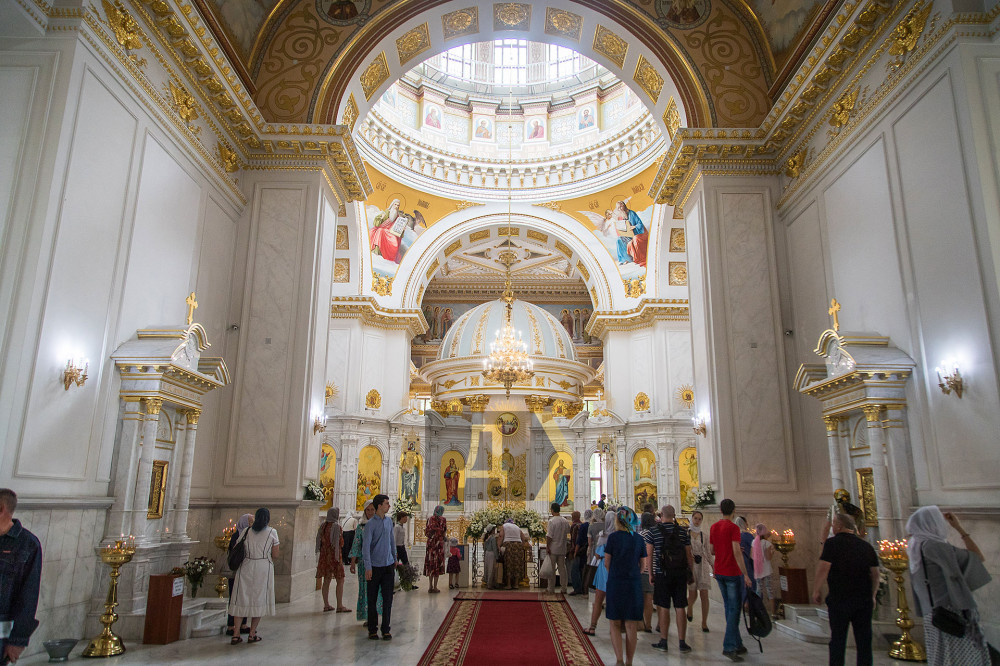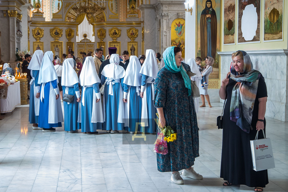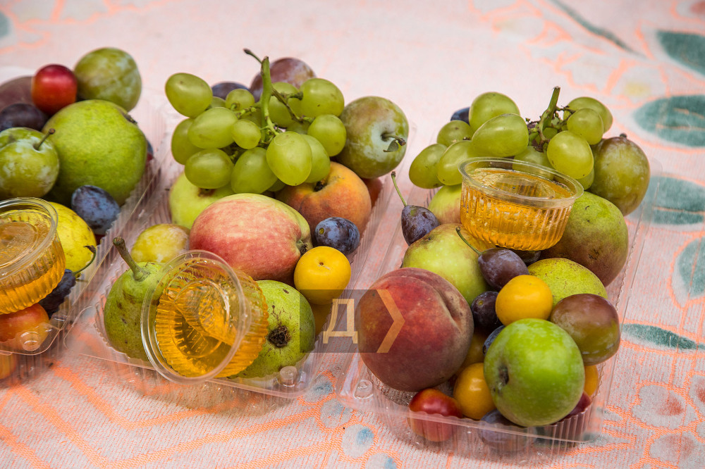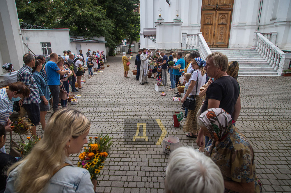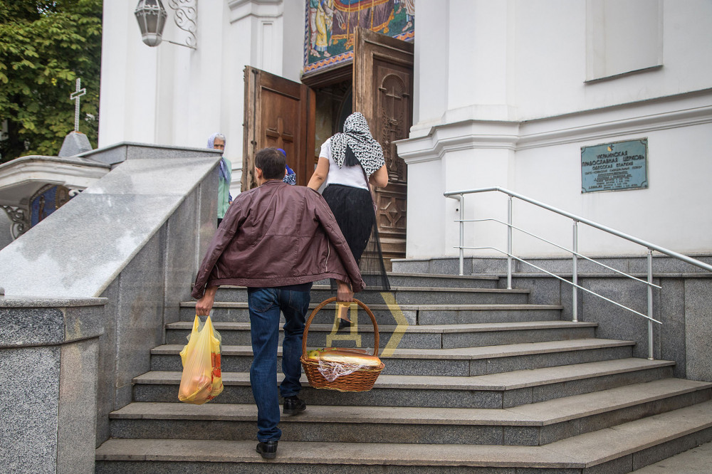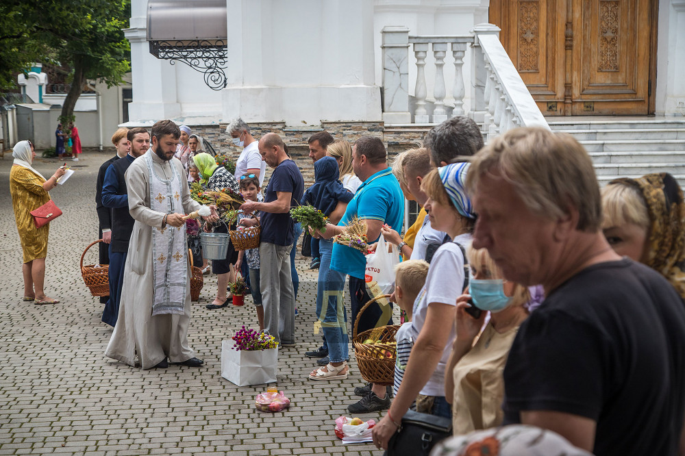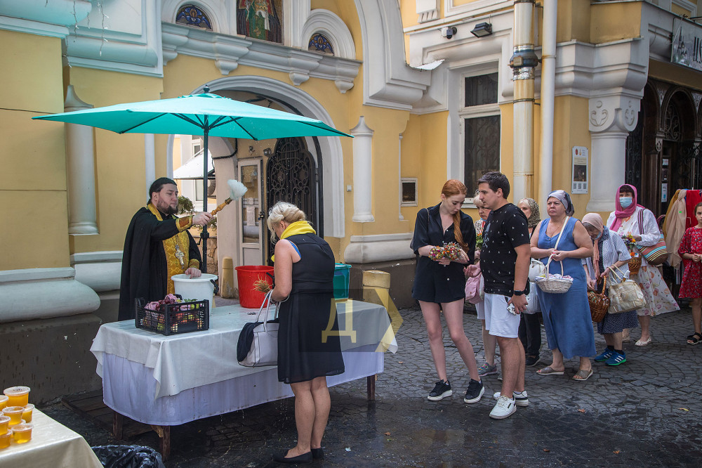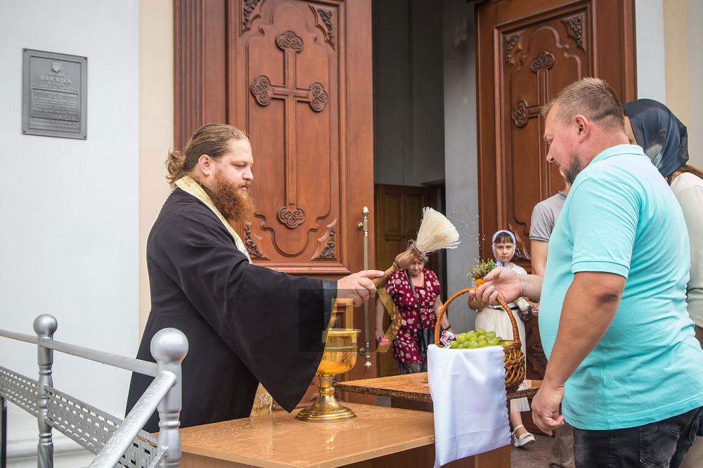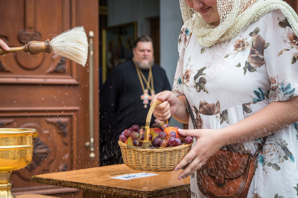 Освящение корзинок и прихожан происходит на улице, у входа в церкви. Возле Преображенского собора также бесплатно раздают угощение — гречневую кашу и компот.