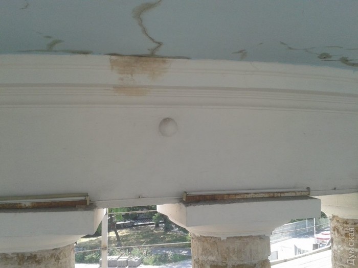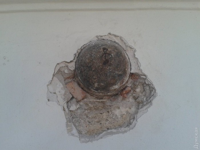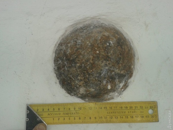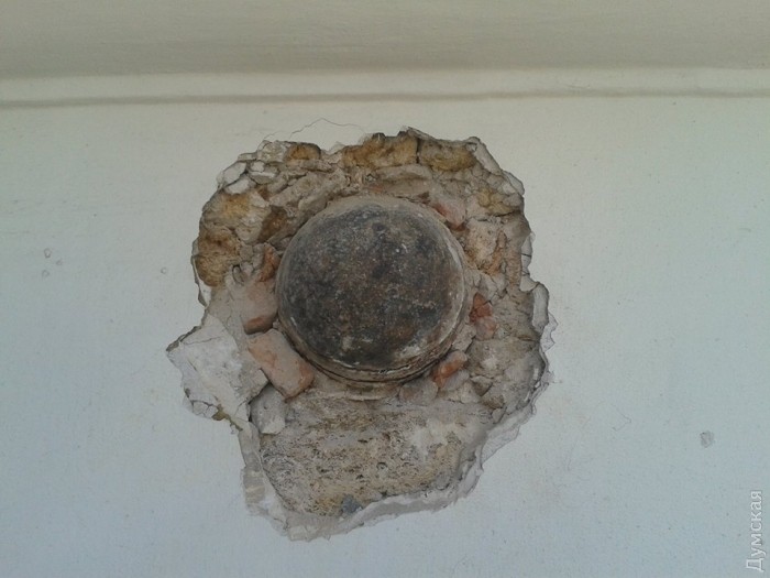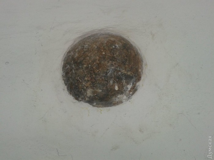 Отметим, что точно такое же искусственно вделанное ядро есть в пьедестале памятника Дюку. Еще один снаряд засел в стене Воронцовского дворца.