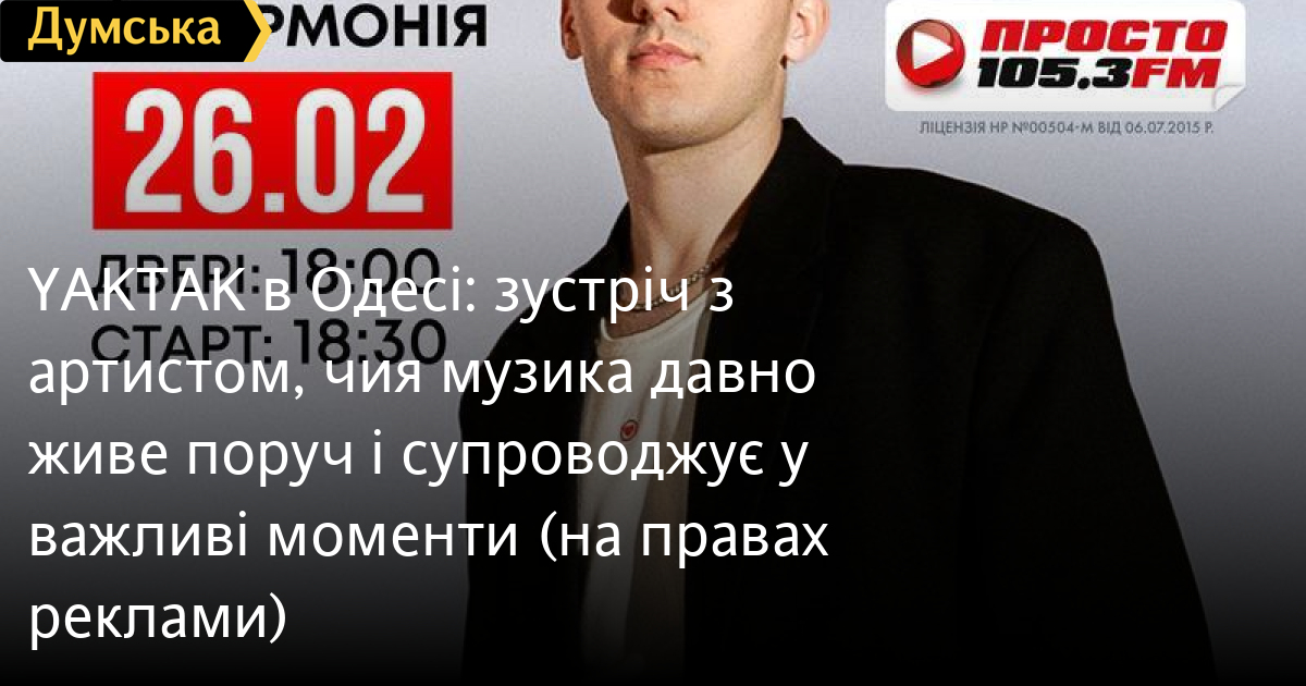 YAKTAK в Одесі: зустріч з артистом, чия музика давно живе поруч і супроводжує у важливі моменти (на правах реклами)Є події, що минають непомітно, а є ті, що змінюють нас назавжди. Саме такою обіцяє стати довгоочікувана зустріч з артистом, чия музика давно живе поруч і супроводжує у важливі моменти. Концерт YAKTAK в Одесі відбудеться сьогодні 26 лютого 2026 року о 18:30 у Одеській обласній філармонії. Чому варто піти на концерт YAKTAK в Одесі? - яскравий артист, що вже виборов собі помітне місце в сучасному музичному просторі країни; - улюблені треки в живому виконанні; -безцінна нагода поспілкуватися з кумиром у дружній атмосфері. YAKTAK – один із найпомітніших представників нового покоління української сцени. Його хіти «Ендорфін», «Небо», «Погляд», «Уночі» давно вийшли за межі стримінгів і стали частиною особистих історій тисяч слухачів. Кожен концерт YAKTAK – це повні зали, великі майданчики та відчуття абсолютної єдності, коли зал підхоплює кожен рядок уже з перших акордів. Треки, які та ставиш на repeat, – нарешті в живому виконанні YAKTAK – це про справжні емоції, які неможливо приховати. Його пісні супроводжували щасливі дні, непрості вечори й моменти закоханості, лунали в навушниках глибокої ночі та заповнювали танцполи живою енергією. Тепер ці композиції зазвучать наживо, у повному обсязі почуттів і переживань. Шоу-програма створить особливу атмосферу, яка залишиться з тобою надовго після фінального акорду. Квитки вже у продажу на Concert.ua. Замовляйте онлайн. СМЕРТЬ РОСІЙСЬКИМ ОКУПАНТАМ! Помітили помилку? Виділяйте слова з помилкою та натискайте control-enter |