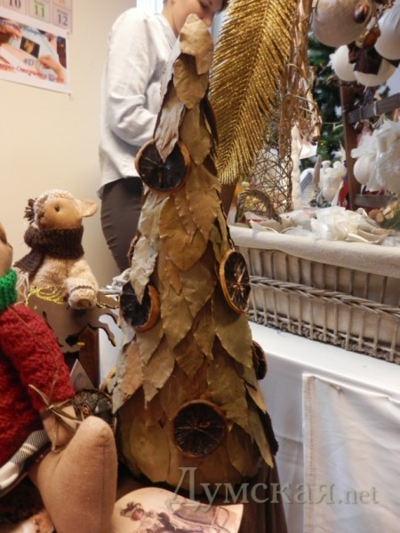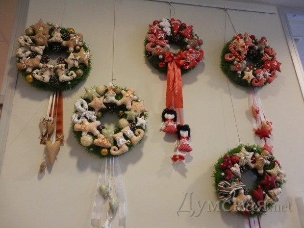 Внутри собора работает выставка рукодельных изделий. В ней участвуют три десятка умельцев из разных городов Украины. Товар в основном рождественско-новогодний — венки на дверь (100-400 грн), авторские открытки (20-40 грн), елочные шары (20-50 грн за штуку) и масса всевозможных лошадок, символов наступающего года. Кроме того, в храме можно приобрести и миниатюрную елочку — их там великое разнообразие. Как оказалось, новогодний атрибут можно сделать и макарон, мягких игрушек, конфет и даже лавровых листиков.