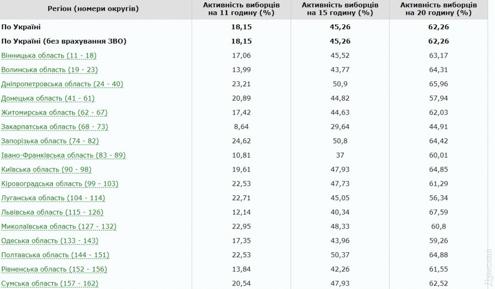 Самый высокий показатель активности избирателей зафиксирован во Львовской области, где проголосовали 68,91% избирателей и в Киеве -68,05%, а самый низкий — в Закарпатье — 47%.