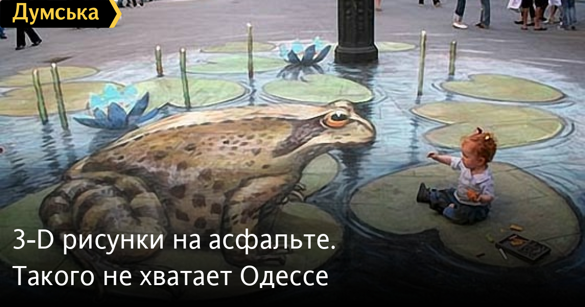 Во многих городах мира стали появляться 3-D объемные рисунки на асфальте. Уникальны они тем, что глядя на них с определенной стороны, возникает восхитительный эффект реалистичности и трехмерности. К огромному сожалению, эта мода еще не добралась до Одессы, да и вряд ли доберется в ближайшее время