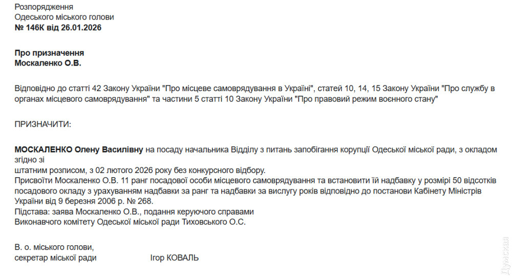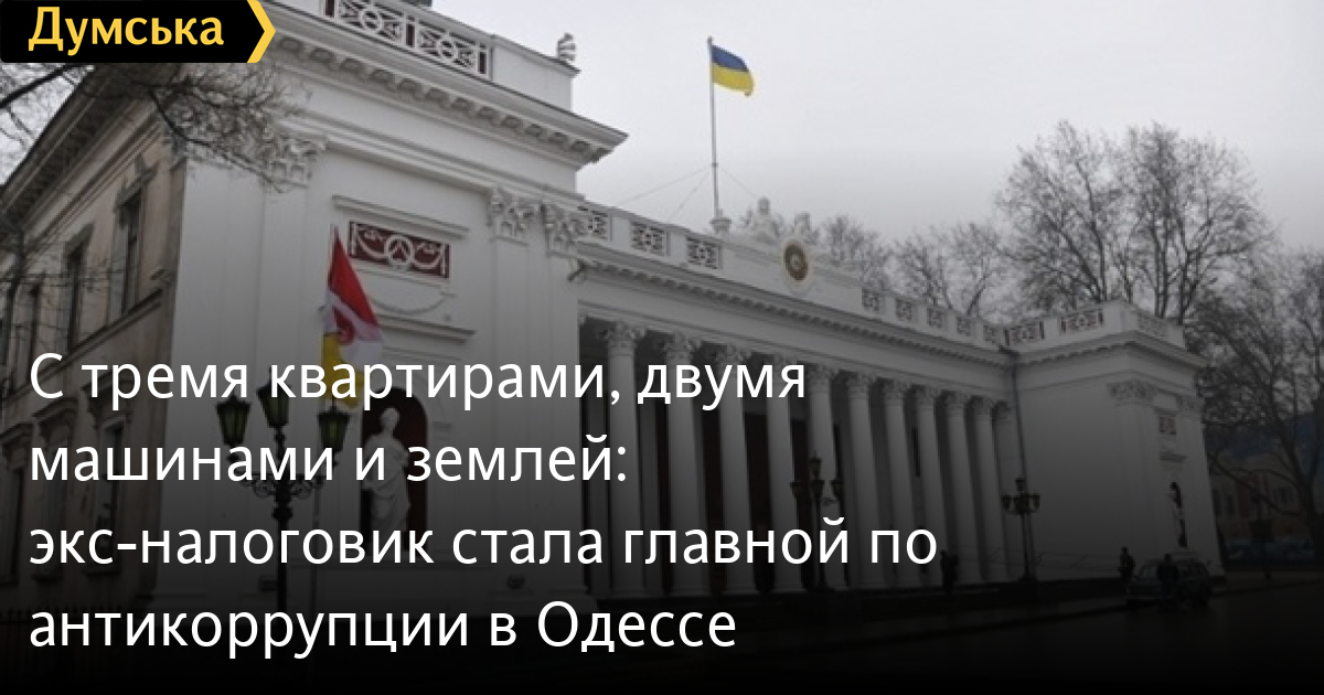 С тремя квартирами, двумя машинами и землей: экс-налоговик стала главной по антикоррупции в ОдессеНачальником антикоррупционного отдела мэрии в Одессе стала бывшая инспектор налоговой службы Елена Москаленко. Распоряжение о ее назначении подписал и.о. городского головы Игорь Коваль, передает корреспондент «Думской». Чиновница приступает к работе сегодня, 2 февраля. Она заняла должность по упрощенной процедуре без конкурсного отбора. Помимо базовой зарплаты, начальница отдела будет получать существенную доплату — ее оклад увеличили на 50% за статус должностного лица и предыдущий стаж работы в госструктурах. Однако, судя по декларации за прошлый год, пани Москаленко — человек совсем не бедный. До этого назначения она строила карьеру в налоговой службе, занимая должность главного государственного инспектора ГУ ГНС в Одесской области. Судя по финансовым отчетам за 2025 год, к квартире площадью 44 кв. м, которую она имела с 2014-го, добавились еще две — площадью 71 и 82 кв. м, а также земельный участок на 3,5 гектара в Березовском районе, полученный в наследство. Автопарк новой антикоррупционерки также обновился: к старой Toyota RAV4 2006 года выпуска добавился электрокроссовер BYD Yuan Up 2025 года. За год работы в налоговой Елена Москаленко заработала 510 тысяч гривен и получила 78 200 гривен пенсии. Бонусом стал денежный подарок в размере почти 1,3 миллиона гривен от некоего Василия Даниленко. Кроме этого, чиновница задекларировала 40 тысяч долларов наличными, еще 20 тысяч гривен держит на банковских счетах. СМЕРТЬ РОССИЙСКИМ ОККУПАНТАМ! Заметили ошибку? Выделяйте слова с ошибкой и нажимайте control-enter |