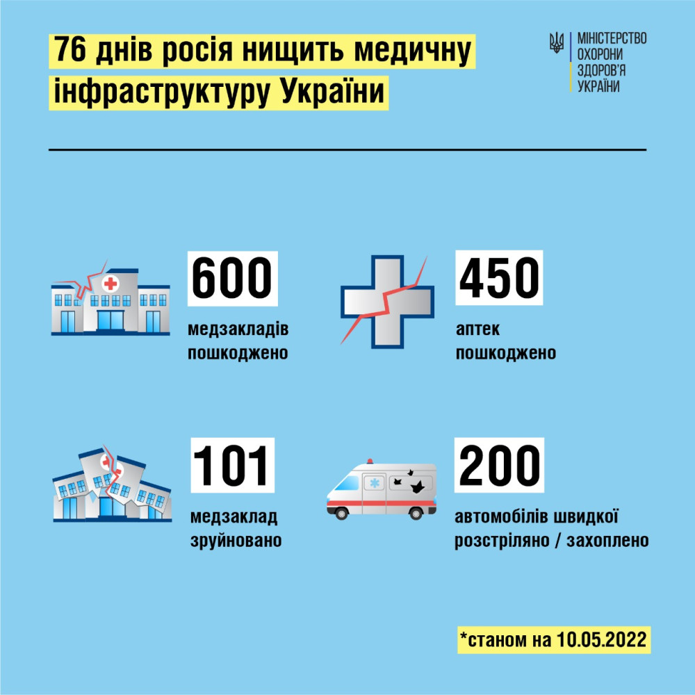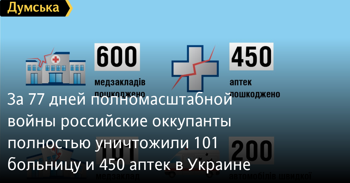 600 украинских медучреждений обстреляли и полностью уничтожили 101 больницу российские нацисты в Украине за 77 дней полномасштабного вторжения.