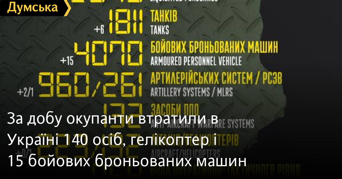 140 осіб, один гелікоптер і шість танків втратили окупанти за минулу добу в Україні.