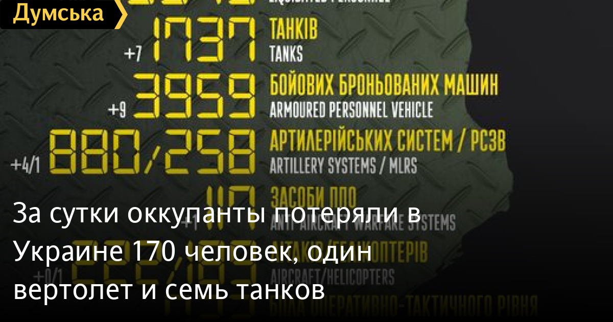 За добу окупанти втратили в Україні 170 осіб, один гелікоптер і сім танків