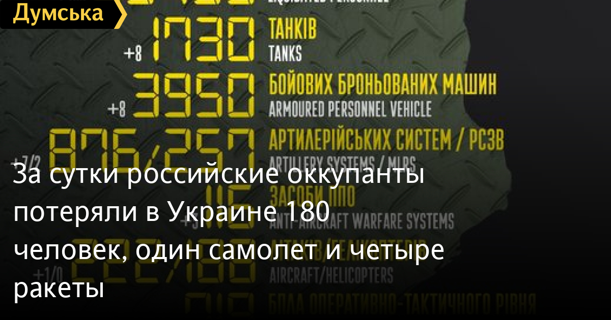За добу російські окупанти втратили в Україні 180 осіб, один літак і чотири ракети