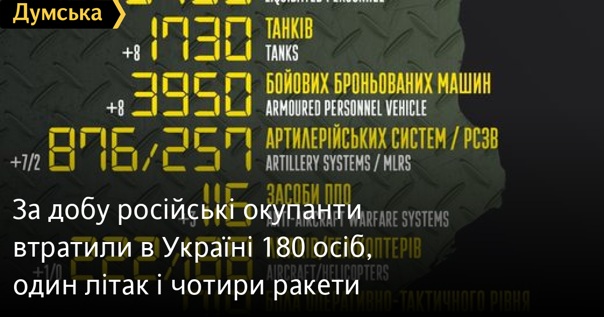 180 осіб, вісім танків і чотири крилаті ракеті втратили окупанти за минулу добу в Україні.