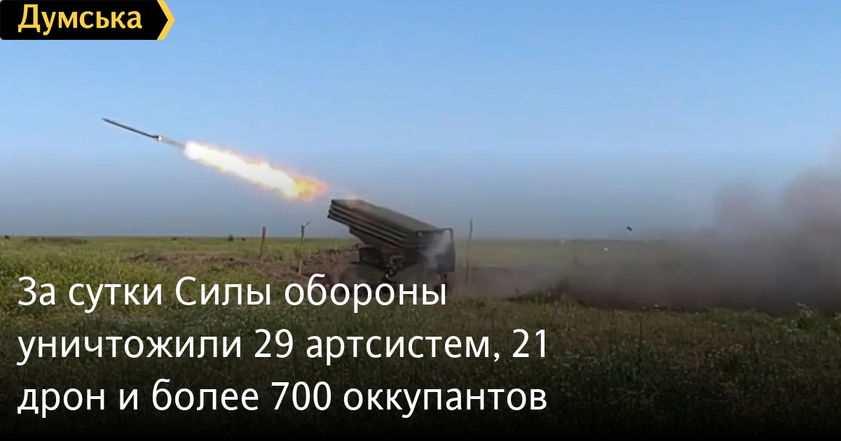 За добу Сили оборони знищили 29 ворожих артсистем, 21 дрон і понад 700 окупантів29 артсистем, 21 дрон оперативно-тактичного рівня та 730 військових втратили окупанти в Україні за минулу добу. Крім того, за даними Генерального штабу Збройних сил України, наші захисники знищили два танки, 16 бойових броньованих машин, два засоби ППО, 12 одиниць автомобільної техніки та дві — спецтехніки. Усього з початку повномасштабного вторгнення втрати ворога склали: особового складу ‒ 203160 (+730) осіб ліквідовано танків ‒ 3783 (+2) бойових броньованих машин ‒ 7398 (+16) артилерійських систем ‒ 3258 (+29) РСЗВ ‒ 564 (0) засоби ППО ‒ 327 (+2) літаків ‒ 308 (0) гелікоптерів ‒ 294 (0) БПЛА оперативно-тактичного рівня ‒ 2822 (+21) крилаті ракети ‒ 1011 (0) кораблі / катери ‒ 18 (0) автомобільної техніки та автоцистерн ‒ 6115 (+12) спеціальна техніка ‒ 425 (+2) СМЕРТЬ РОСІЙСЬКИМ ОКУПАНТАМ! Помітили помилку? Виділяйте слова з помилкою та натискайте control-enter |