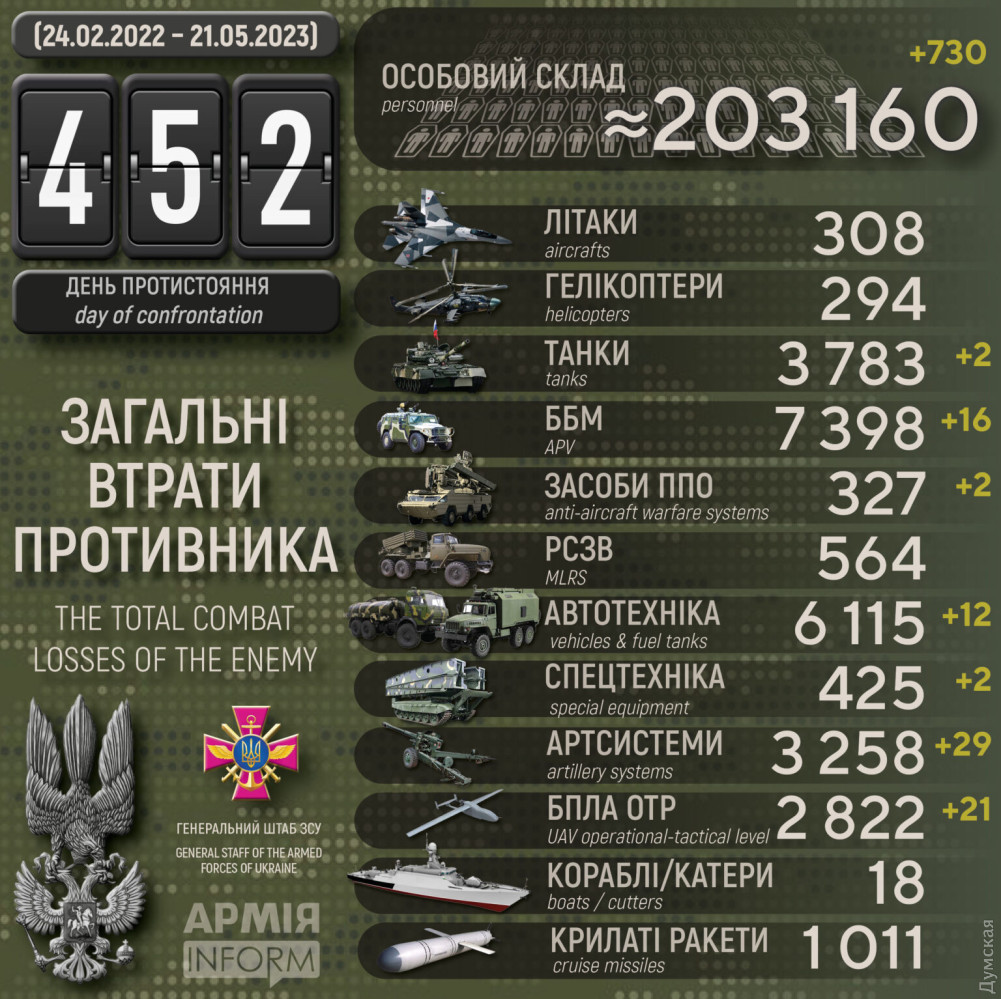 За добу Сили оборони знищили 29 ворожих артсистем, 21 дрон і понад 700 окупантів29 артсистем, 21 дрон оперативно-тактичного рівня та 730 військових втратили окупанти в Україні за минулу добу. Крім того, за даними Генерального штабу Збройних сил України, наші захисники знищили два танки, 16 бойових броньованих машин, два засоби ППО, 12 одиниць автомобільної техніки та дві — спецтехніки. Усього з початку повномасштабного вторгнення втрати ворога склали: особового складу ‒ 203160 (+730) осіб ліквідовано танків ‒ 3783 (+2) бойових броньованих машин ‒ 7398 (+16) артилерійських систем ‒ 3258 (+29) РСЗВ ‒ 564 (0) засоби ППО ‒ 327 (+2) літаків ‒ 308 (0) гелікоптерів ‒ 294 (0) БПЛА оперативно-тактичного рівня ‒ 2822 (+21) крилаті ракети ‒ 1011 (0) кораблі / катери ‒ 18 (0) автомобільної техніки та автоцистерн ‒ 6115 (+12) спеціальна техніка ‒ 425 (+2) СМЕРТЬ РОСІЙСЬКИМ ОКУПАНТАМ! Помітили помилку? Виділяйте слова з помилкою та натискайте control-enter |