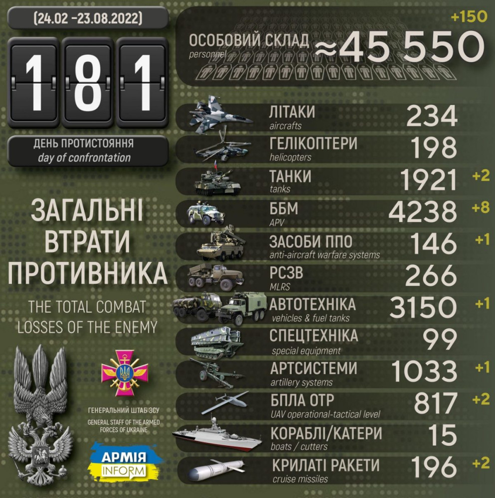 Крім того, за даними Генерального штабу Збройних сил України, наші захисники також знищили вісім бойових броньованих машин, одну артсистему, один засіб ППО, два БПЛА оперативно-тактичного рівня і одну одиницю автомобільної техніки.