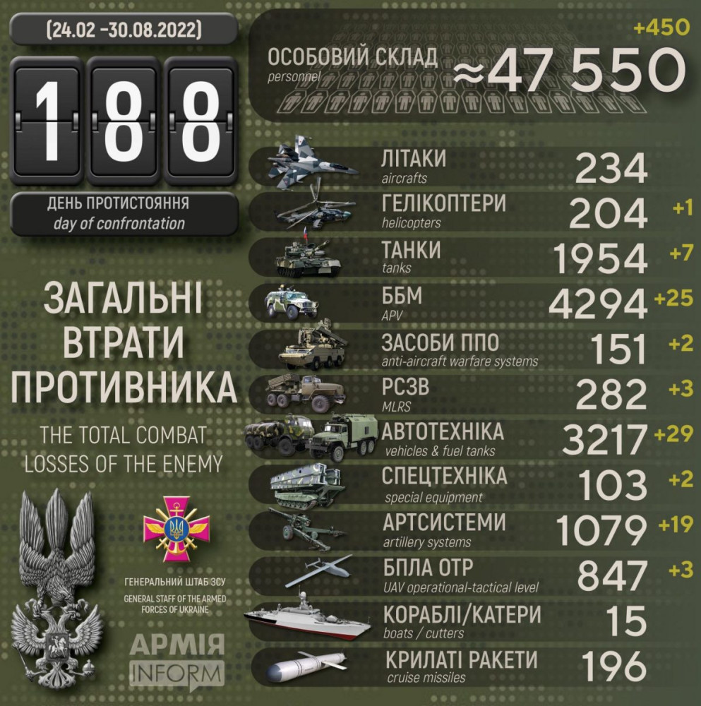 Крім того, за даними Генерального штабу Збройних сил України, наші захисники також знищили сім танків, 19 артсистем, три РЗСВ, два засоби ППО, три БПЛА оперативно-тактичного рівня, 29 одиниць автомобільної техніки і дві одиниці спецтехніки.