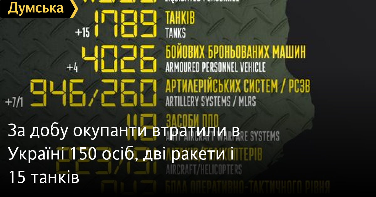 150 осіб, дві крилаті ракети і 15 танків втратили окупанти за минулу добу в Україні.
