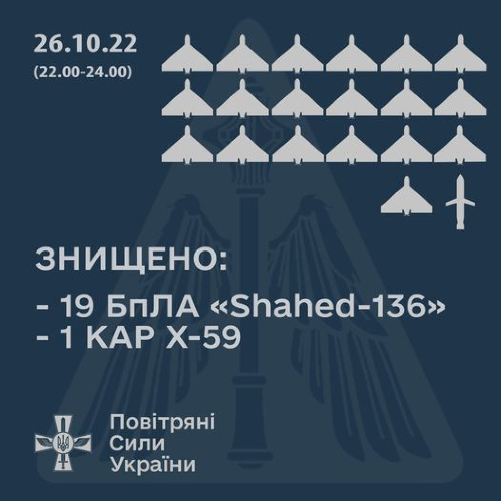 Як повідомили в Командуванні Повітряних сил України, окупанти випустили понад два десятки Shahed-136 з 22:00 по 24:00.