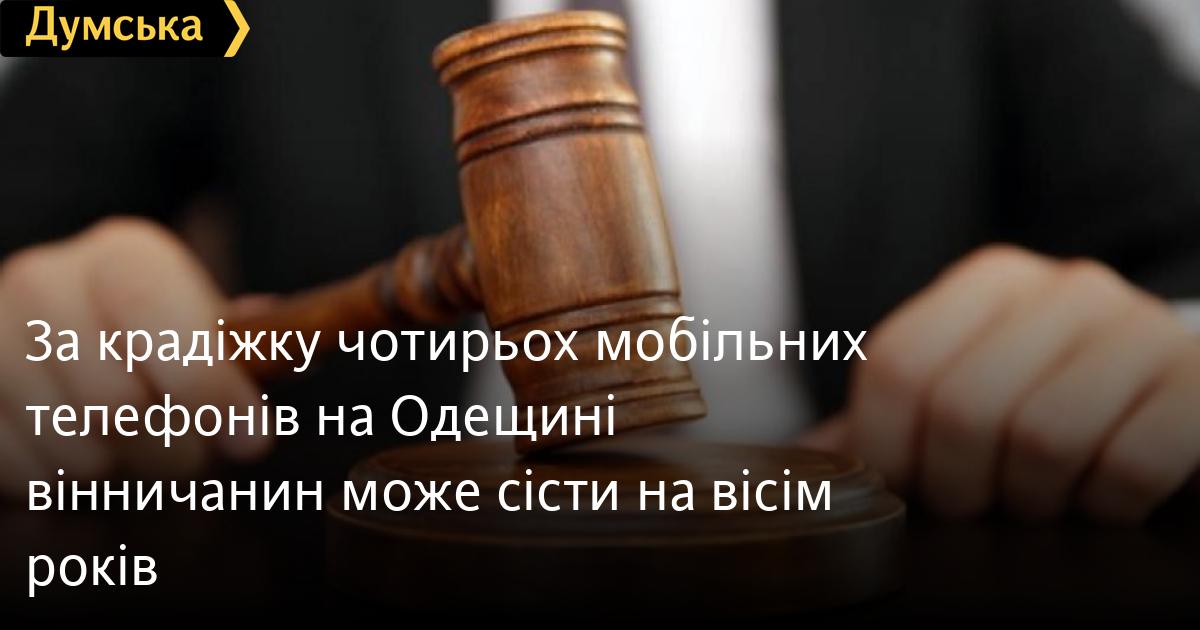 За крадіжку чотирьох мобільних телефонів на Одещині вінничанин може сісти на вісім років21-річний вінничанин постане перед судом в Одеській області за крадіжку чотирьох мобільних телефонів. Йому загрожує до восьми років в'язниці. Як повідомили у пресслужбі поліції регіону, наприкінці січня цього року до правоохоронців надійшла інформація про крадіжку мобільного у пасажирки електропоїзда. Жінка заявила, що підозрює у злочині попутника, який вийшов на станції в Подільську. Поліція перевірила камери відеоспостереження, опитала співробітників вокзалу і затримала зловмисника, який після того, як продав вкрадене, знову повернувся на вокзал. Під час розслідування слідчі встановили, що в січні молодий чоловік вкрав ще два телефони у людей в залі очікування підвищеного комфорту, а також один — у кімнаті відпочинку. Загальна сума матеріальних збитків склала близько 25 тисяч гривень. Чоловікові висунули обвинувачення за ч. 4 ст. 185 КК України та скерували справу до суду. Правопорушнику загрожує від п'яти до восьми років позбавлення волі. З'ясувалося, що молодик має судимість за крадіжку у Вінниці. Помітили помилку? Виділяйте слова з помилкою та натискайте control-enter Новини по цій темі: 29 липня 2025: В Усатово Одеської області сталася перестрілка: поліція працює на місці (відео, оновлено) 28 липня 2025: П'яний на "Ягуарі" або гіпертонік? Звільнений топ-посадовець одеської поліції хоче повернутися на службу 19 червня 2025: Дівчинку, яку шукали сотні одеситів, знайшли вбитою: поліція працює з чоловіком, ймовірно причетним до загибелі 27 травня 2025: Увели гектар в університету: на Одещині засудили земельних аферистів, але без посадки і Хвоста |