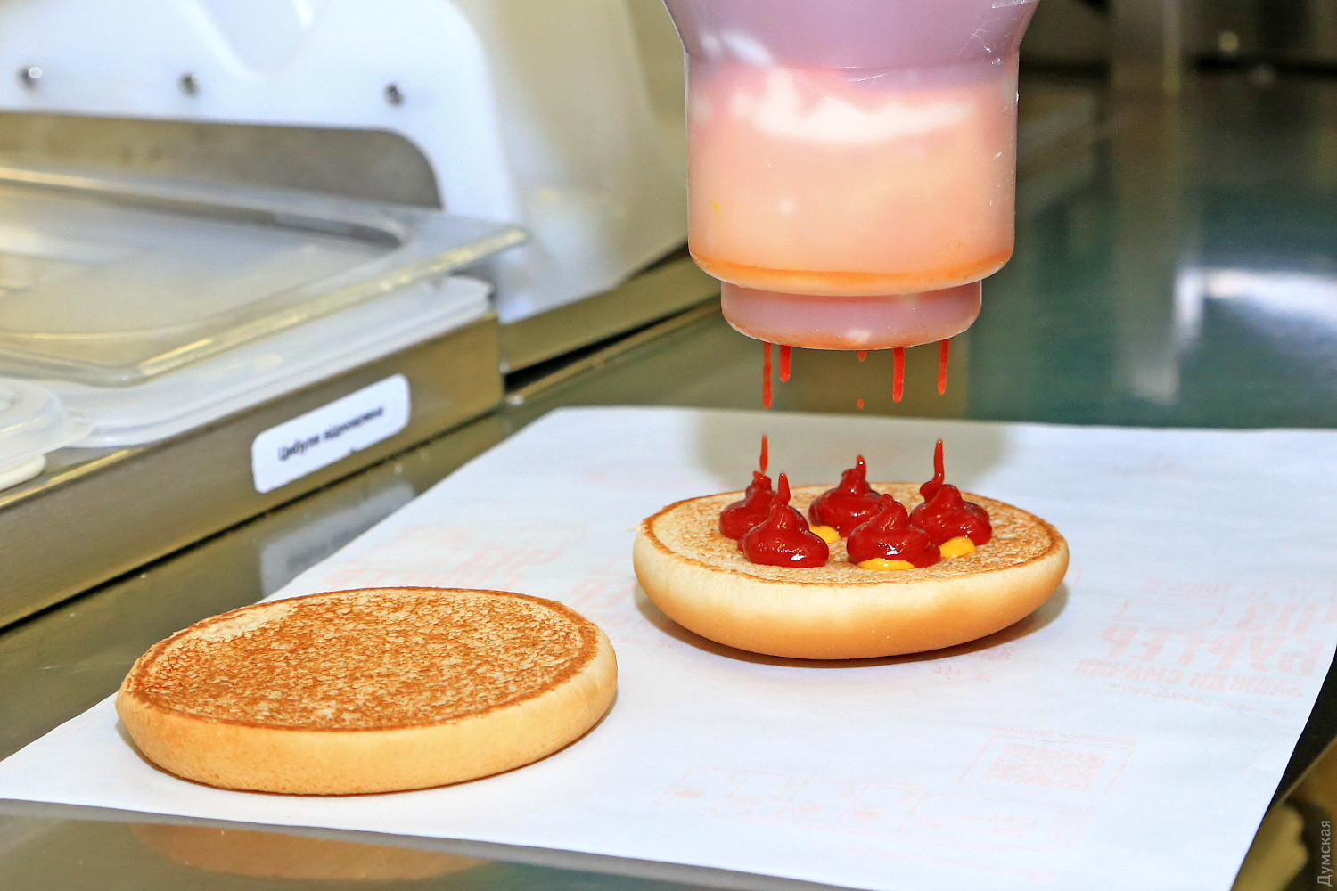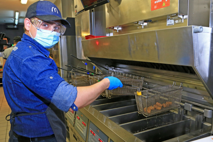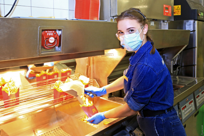 В период пандемии McDonald's полностью сохранил свою команду и открыл несколько новых ресторанов. Чтобы разобраться, за счет чего McDonald's смог сохранить свои позиции на рынке, корреспондент «Думской» отправился в один из одесских ресторанов. Санитарные требования пребывания на кухне настолько высоки, что корреспонденту пришлось сдать ПЦР-тест. Директор McDonald's, что на проспекте Шевченко, 26 Татьяна Дробот, любезно встретив у входа, сразу предупредила, что для посещения кухни придется переодеться, облачиться в халат, бахилы и шапочку, не говоря уже о перчатках и маске. В 2020 году компания пошла на беспрецедентные меры ради сохранения здоровья сотрудников и недопущения распространения COVID-19 в залах. На выплату компенсаций за простой и вынужденные отпуска было потрачено 50 миллионов гривен, а на средства защиты от коронавируса – еще 82 миллиона. Татьяна Дробот рассказывает, что все сотрудники ресторана, приходя на смену, проходят температурный контроль, а все действия перед началом работы строго регламентированы – существует строгая очередность обработки рук и одевания рабочей одежды, масок, очков и перчаток. «Все подчинено главной задаче — приготовлению качественной и безопасной пищи», — отмечает директор ресторана. Экскурсия началась с осмотра складских помещений: в нескольких холодильных комнатах хранятся разные продукты, в том числе мясо для приготовления бифштексов при температуре минус 18 градусов. В ресторане есть также станция очистки воды и свой мини-завод для приготовления фирменных напитков – фанты, кока-колы и спрайта. По словам Татьяны Дробот, за последний год в ресторане установлено новое оборудование, с помощью которого удалось значительно сократить трудозатраты на обеспечение качества продукции. «Например, раньше показания термометров в холодильниках приходилось записывать несколько раз в час, сейчас же установлены специальные датчики — логеры, которые по интернету отправляют показания в киевский офис компании, где их контролирует специальная система, выдавая в случае отклонения от нормы предупреждающий сигнал», — отмечает директор. Интересно, что 60% ингредиентов для приготовления бургеров – булочки, мясо, овощи, масло, специи, кетчупы производят в Украине. Любое блюдо проходит около 100 проверок на разных этапах приготовления: это выращивание на полях, транспортировка и процессы производства. Продукция проверяется на соответствие стандартам McDonald's, а также регламентам украинского и европейского законодательства. Ежемесячно в каждом ресторане проводятся микробиологические исследования готовой продукции. Процессы жарки продуктов также тщательно контролируются. Например, для обеспечения высокого качества картофеля фри температура масла поддерживается в интервале плюс-минус нескольких градусов, через каждые 12 порций масло фильтруется автоматически, а специальным прибором можно контролировать количество жирных кислот. Если показания достигают 20%, всю порцию масла меняют. Основному компоненту бифштекса — мясу — уделяется ключевое внимание. Его готовят на специальном гриле, где порционные куски зажаты между двумя жарочными поверхностями без добавления масла. Верхний гриль имеет температуру 217 градусов, нижний 177 - и ни градусом больше или меньше. Поставляется говядина из городка Козятин, что в Винни
