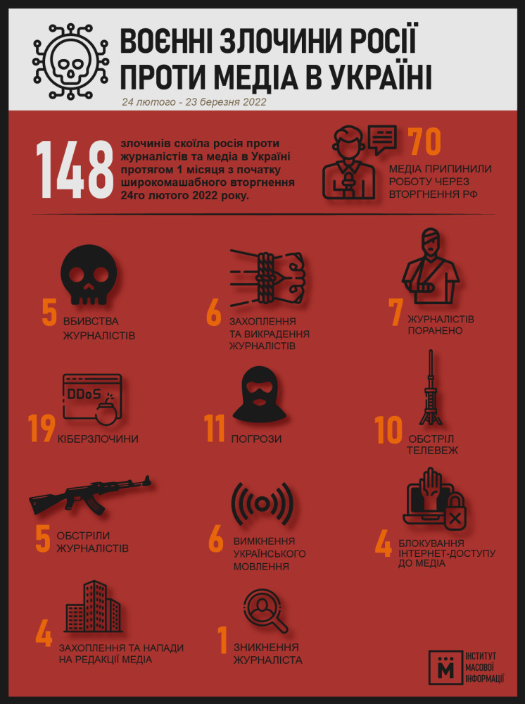 «По состоянию на 24 марта пятеро журналистов убиты во время исполнения профессиональных обязанностей, семеро ранены, один журналист пропал без вести. ИМИ известно о по меньшей мере шести случаях захвата журналистов россиянами в заложники и жестокого обращения с ними»,- сообщается на платформе Института.