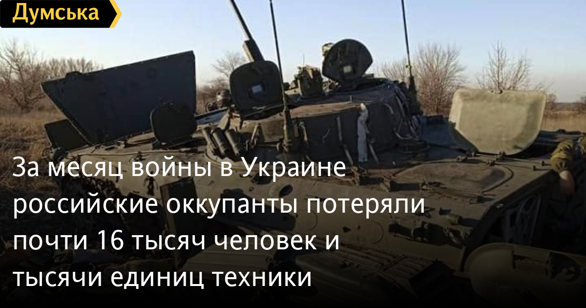 За месяц войны в Украине российские оккупанты потеряли почти 16 тысяч человек и тысячи единиц техникиЗа месяц полномасштабного военного вторжения в Украину российские оккупанты понесли серьезные потери в живой силе и технике. С 24 февраля по сегодняшний день общие боевые потери врага составили: личного состава — около 15 800 человек; танков ‒ 530 единиц; боевых бронированных машин ‒ 1597 единиц; артиллерийских систем – 280 единиц; РСЗО — 82 единицы; средства ПВО - 47 единиц; самолетов – 108 единиц; вертолетов – 124 единицы; автомобильной техники — 1033 единицы; корабли/катера — 4 единицы; цистерн с ГСМ - 72; БПЛА оперативно-тактического уровня – 50; специальная техника – 16. СМЕРТЬ РОССИЙСКИМ ОККУПАНТАМ! Заметили ошибку? Выделяйте слова с ошибкой и нажимайте control-enter |