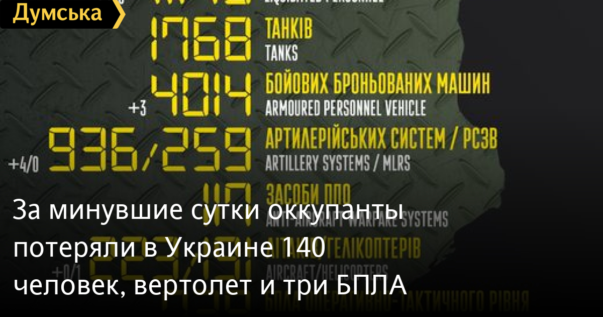 За минулу добу окупанти втратили в Україні 140 осіб, гелікоптер і три БПЛА140 осіб, чотири артсистеми і один гелікоптер втратили окупанти за минулу добу в Україні. Крім того, за даними Генерального штабу Збройних сил України, українські захисники також знищили три бойових броньованих машини, три БПЛА оперативно-тактичного рівня и дві одиниці автомобільної техніки. Усього з початку повномасштабного вторгнення втрати ворога склали: особового складу — 41 170 осіб; танків ‒ 1768 одиниць; бойових броньованих машин ‒ 4014 одиниць; артилерійських систем – 936 одиниць; РСЗВ — 259 одиниць; засоби ППО - 117 одиниць; літаків – 223 одиниці; гелікоптерів – 191 одиниця; БПЛА оперативно-тактичного рівня — 739; крилаті ракети — 174; кораблі /катери — 15 одиниць; автомобільної техніки та автоцистерн — 2914 одиниць; спеціальна техніка — 82. СМЕРТЬ РОСІЙСЬКИМ ОКУПАНТАМ! Помітили помилку? Виділяйте слова з помилкою та натискайте control-enter |