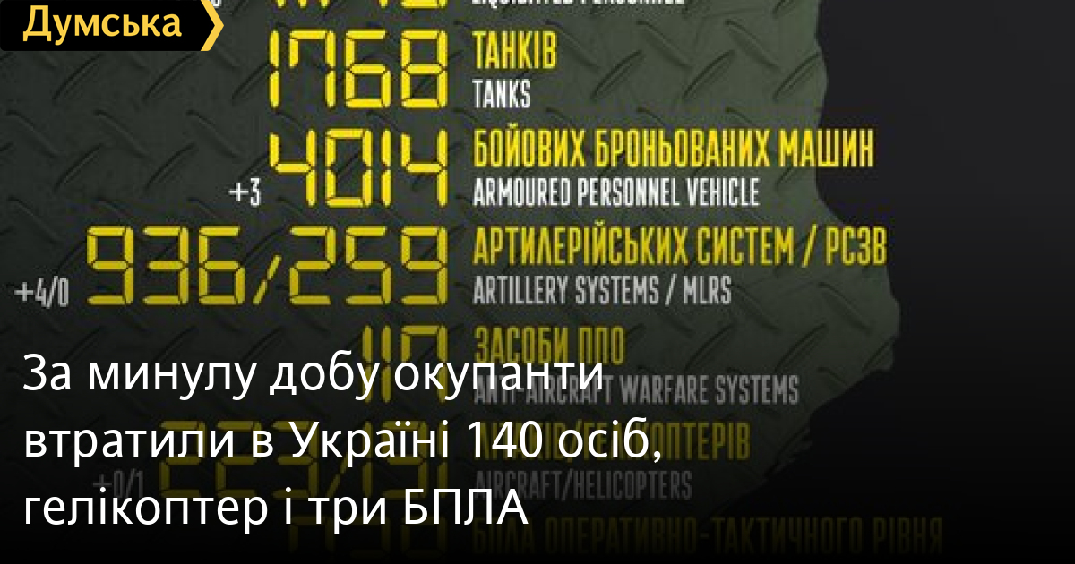140 осіб, чотири артсистеми і один гелікоптер втратили окупанти за минулу добу в Україні.
