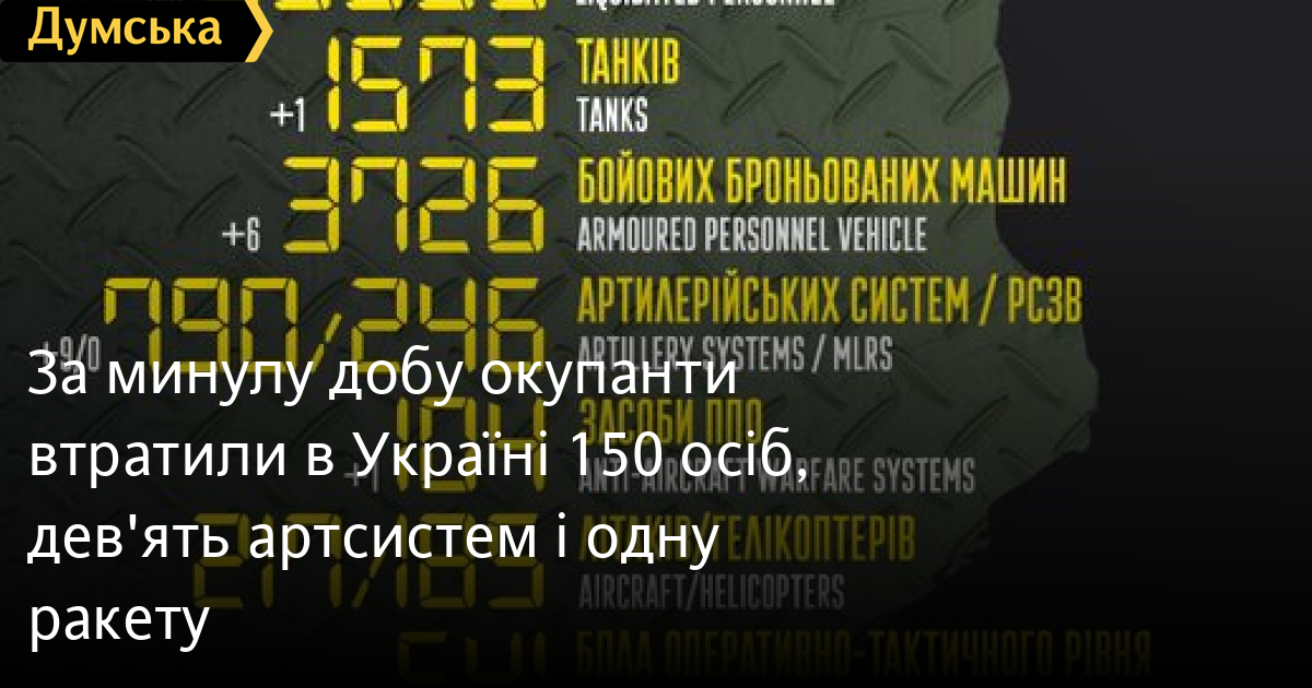 150 осіб, одну ракету и шість бойових броньованих машин втратили за минулу добу російські окупанти в Україні.