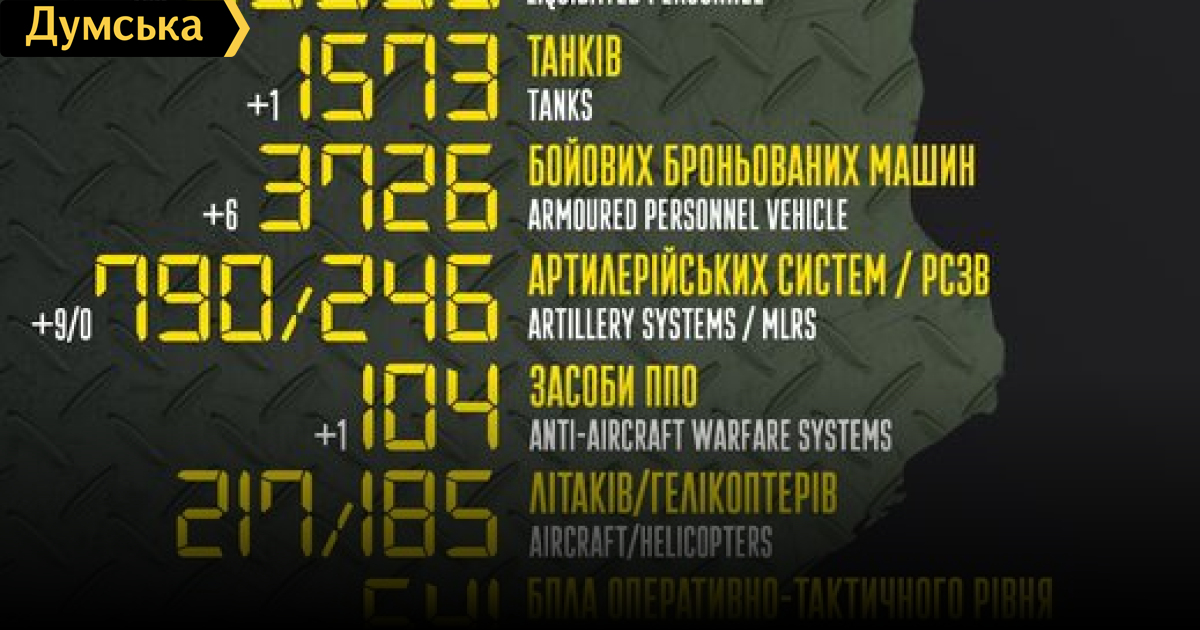 За минулу добу окупанти втратили в Україні 150 осіб, дев'ять артсистем і одну ракету150 осіб, одну ракету и шість бойових броньованих машин втратили за минулу добу російські окупанти в Україні. Крім того, як повідомляє Генштаб Збройних сил, українські захисники знищили один танк, дев'ять артсистем, один засіб ППО, один БПЛА оперативно-тактичного рівня і чотири одиниці автомобільної техніки. Всього з початку повномасштабного вторгнення втрати ворога склали: особового складу — 35 600 осіб; танків ‒ 1573 одиниці; бойових броньованих машин ‒ 3726 одиниць; артилерійських систем – 790 одиниць; РСЗВ — 246 одиниць; засоби ППО - 104 одиниці; літаків – 217 одиниць; гелікоптерів – 185 одиниць; БПЛА оперативно-тактичного рівня — 641; крилаті ракети — 143; кораблі /катери — 14 одиниць; автомобільної техніки та автоцистерн — 2602 одиниці; спеціальна техніка — 61. СМЕРТЬ РОСІЙСЬКИМ ОКУПАНТАМ! Помітили помилку? Виділяйте слова з помилкою та натискайте control-enter |