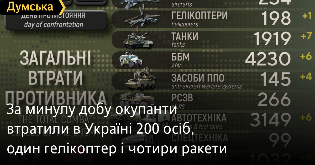 200 осіб, один гелікоптер і сім танків втратили окупанти за минулу добу в Україні.