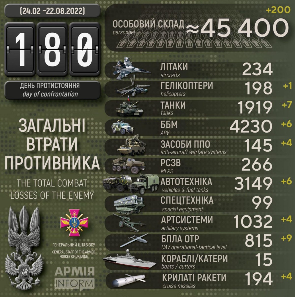 Крім того, за даними Генерального штабу Збройних сил України, наші захисники також знищили шість бойових броньованих машин, чотири артсистеми, чотири засоби ППО, дев'ять БПЛА оперативно-тактичного рівня, чотири крилаті ракети і шість одиниць автомобільної техніки.
