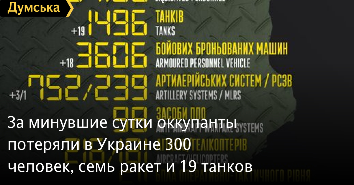300 солдат, 19 танков и семь крылатых ракет потеряли российские нацисты за минувшие сутки в Украине.