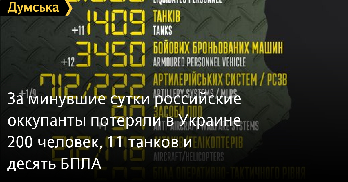 200 солдат, 11 танков и одну артиллерийскую систему потеряли российские нацисты за минувшие сутки в Украине.