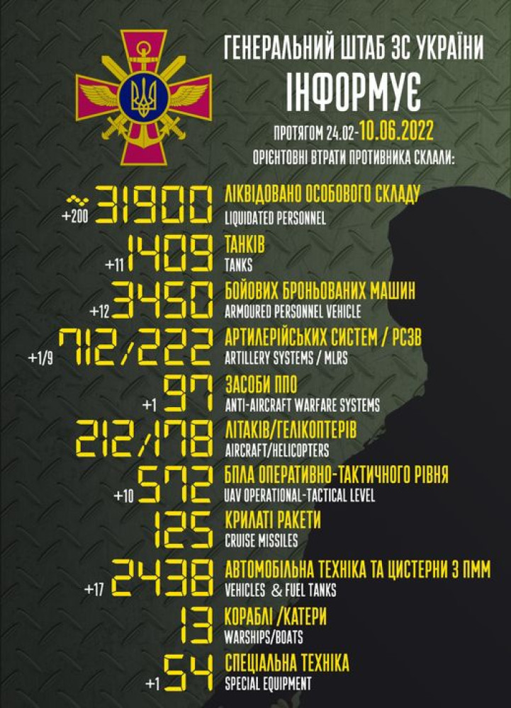 Кроме того, как сообщает Генштаб Вооруженных сил, украинские защитники уничтожили 12 боевых бронированных машин, девять РСЗО, одно средство ПВО, десять БПЛА оперативно-тактического уровня, 17 единиц автомобильной техники и одну единицу спецтехники.