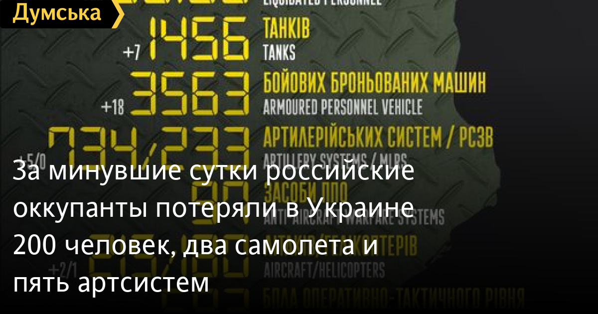 200 солдат, два самолета и семь танков потеряли российские нацисты за минувшие сутки в Украине.