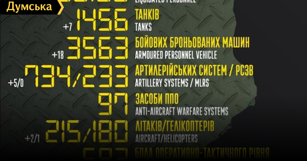 За минувшие сутки российские оккупанты потеряли в Украине 200 человек, два самолета и пять артсистем200 солдат, два самолета и семь танков потеряли российские нацисты за минувшие сутки в Украине. Кроме того, как сообщает Генштаб Вооруженных сил, украинские защитники уничтожили 18 боевых бронированных машин, пять артиллерийских систем, один вертолет, два БПЛА оперативно-тактического уровня и две единицы автомобильной техники. Всего с начала полномасштабного вторжения потери врага составили: личного состава — 32 150 человек; танков 1456 единиц; боевых бронированных машин 3563 единицы; артиллерийских систем – 734 единицы; РСЗО — 233 единицы; средства ПВО - 97 единиц; самолетов – 215 единиц; вертолетов – 180 единиц; БПЛА оперативно-тактического уровня — 593; крылатые ракеты — 129; корабли/катера — 13 единиц; автомобильной техники и автоцистерн — 2496 единиц; специальная техника – 55. СМЕРТЬ РОСІЙСЬКИМ ОКУПАНТАМ! Помітили помилку? Виділяйте слова з помилкою та натискайте control-enter |