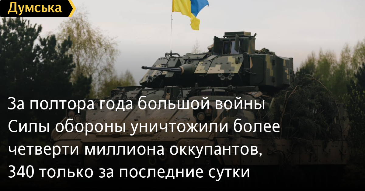 За полтора года большой войны Силы обороны уничтожили более четверти миллиона оккупантов, 340 только за последние суткиБолее четверти миллиона оккупантов, из которых 340 за последние сутки, потеряла российская армия в Украине за минувшие сутки. По данным Генерального штаба Вооруженных сил Украины, наши защитники также уничтожили 15 артиллерийских систем, 20 дронов оперативно-тактического уровня, 2 танка, 23 боевые бронированные машины, 6 дронов оперативно-тактического уровня, реактивную систему залпового огня, 3 средства ПВО, 28 единиц автомобильной техники и единицу спецтехники. Общие боевые потери противника с 24.02.22 по 24.08.23 ориентировочно составляют: личного состава — 259160 (+340) человек ликвидировано танков — 4375 (+2) боевых бронированных машин — 8511 (+23) артиллерийских систем — 5333 (+15) РСЗО — 723 (+1) средства ПВО - 494 (+3) самолетов — 315 (0) вертолетов — 316 (0) БПЛА оперативно-тактического уровня — 4344 (+20) крылатые ракеты — 1406 (0) корабли / катера — 18 (0) автомобильной техники и автоцистерн — 7773 (+28) специальная техника — 801 (+1) СМЕРТЬ РОССИЙСКИМ ОККУПАНТАМ! Заметили ошибку? Выделяйте слова с ошибкой и нажимайте control-enter |