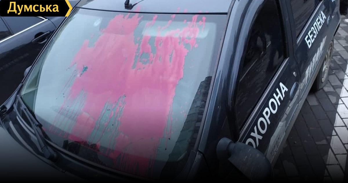 Пока люди находились внутри, кто-то облил автомобили «Титан Секьюрити» краской и проколол колеса.