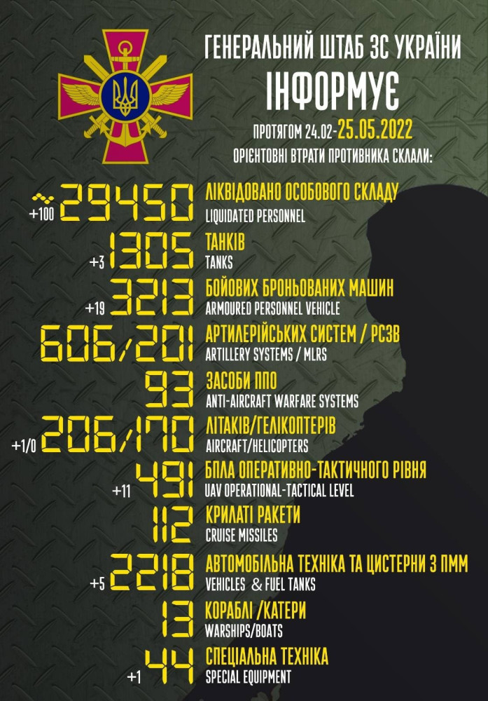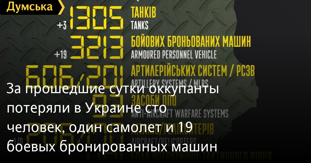 Кроме того, как сообщает Генштаб Вооруженных сил, украинские защитники уничтожили 19 боевых бронированных машин, 11 БПЛА оперативно-тактического уровня, пять единиц автомобильной техники и одну единицу спецтехники.