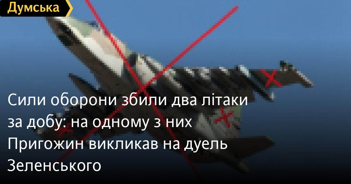 Сили оборони збили два літаки за добу: на одному з них Пригожин викликав на дуель ЗеленськогоДва ворожі літаки знищили Сили оборони минулої доби. Удень на донецькому напрямку було збито штурмовик Су-25, а ближче до вечора фронтовий бомбардувальник Су-24М. Цікаво, що так звана пресслужба керівника вагнерівців Пригожина підтвердила збиття Су-24М. Літак було знищено в районі Бахмута. Це той самий борт, на якому літав кухар путіна і викликав на повітряну дуель Володимира Зеленського. СМЕРТЬ РОСІЙСЬКИМ ОКУПАНТАМ! Помітили помилку? Виділяйте слова з помилкою та натискайте control-enter |