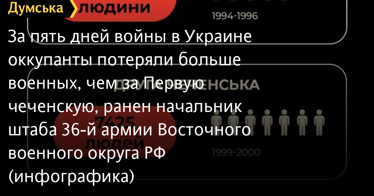 За первые пять дней войны, с 24 до 28 февраля, оккупанты потеряли в Украине больше военных, чем за неполных два года Первой чеченской. Ранен начальник штаба 36 армии Восточного военного округа РФ.