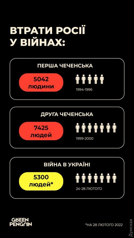 За пять дней войны в Украине оккупанты потеряли больше военных, чем за Первую чеченскую, ранен начальник штаба 36-й армии Восточного военного округа РФ (инфографика)За первые пять дней войны, с 24 до 28 февраля, оккупанты потеряли в Украине больше военных, чем за неполных два года Первой чеченской. Ранен начальник штаба 36 армии Восточного военного округа РФ. Во время упорных боев на Чернобыльском направлении получил ранение начальник штаба 36-й армии (Улан-Удэ) Восточного военного округа, сообщил главнокомандующий вооруженными силами Украины Валерий Залужный. В Северском операционном районе погиб (по другим данным, получил ранение) командир одиннадцатой отдельной десантно-штурмовой бригады (Улан-Удэ) Воздушно-десантных войск ВС РФ. «У российских оккупантов есть два варианта: быть уничтоженными или сдаться. Мы на своей земле, поэтому будем защищать ее до последней капли крови. Как своей, так и захватчика», — добавил Залужный. СМЕРТЬ РОСІЙСЬКИМ ОКУПАНТАМ! Помітили помилку? Виділяйте слова з помилкою та натискайте control-enter |