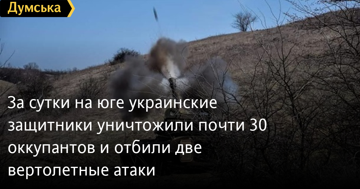 За минувшие сутки на юге страны украинские защитники уничтожили 28 оккупантов, десять единиц техники, два БПЛА и квадрокоптер. Кроме того, были отбиты две вертолетные атаки противника в Николаевской и Херсонской областях.