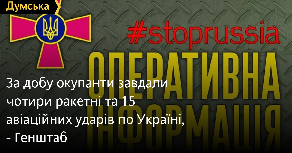 Чотири ракетні та 15 авіаційних ударів завдали російські окупанти по військових та цивільних об’єктах на території України за поточну добу. Окрім того, противник здійснив понад 20 обстрілів з реактивних систем залпового вогню.