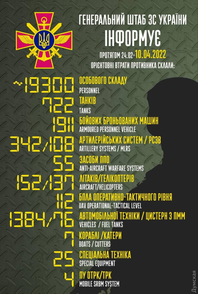 В ходе боев 9 апреля Силы обороны Украины уничтожили 200 российских солдат и офицеров. С 24 февраля армия оккупантов потеряла уже 19300 военнослужащих.