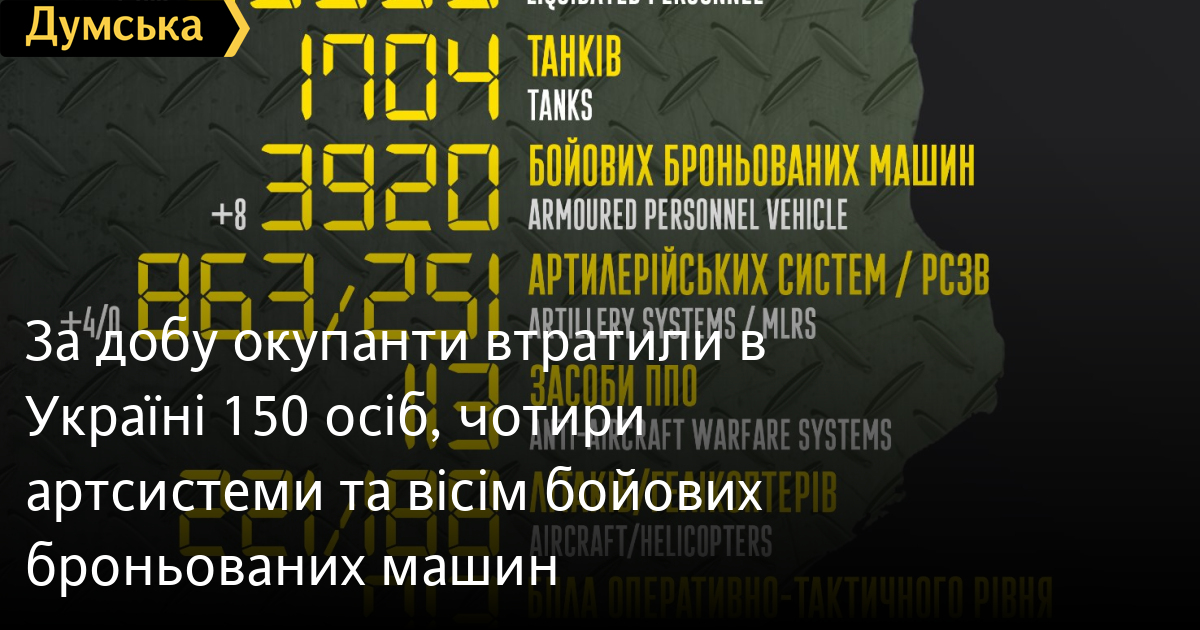 За добу окупанти втратили в Україні 150 осіб, чотири артсистеми та вісім бойових броньованих машин150 осіб, чотири артсистеми та три БПЛА оперативно-тактичного рівня втратили окупанти за минулу добу в Україні. Крім того, за даними Генерального штабу Збройних сил України, українські захисники також знищили вісім бойових броньованих машин та 22 одиниці автомобільної техніки. Усього з початку повномасштабного вторгнення втрати ворога склали: — особового складу — приблизно 39 тис. (+150) осіб; — танків ‒ 1 704 одиниці; — бойових броньованих машин ‒ 3 920 (+8) одиниць; — артилерійських систем – 863 (+4) одиниці; — РСЗВ — 251 одиниця; — засобів ППО — 113 одиниць; — літаків – 221 одиниця; — гелікоптерів – 188 одиниць; — БПЛА оперативно-тактичного рівня — 713 (+3) одиниць; — крилатих ракет — 167 одиниць; — кораблі /катери — 15 одиниць; — автомобільної техніки та автоцистерн — 2 803 (+22) одиниці; — спеціальна техніка — 72 одиниці. Найбільших втрат противник зазнав на криворізькому та бахмутському напрямках. СМЕРТЬ РОСІЙСЬКИМ ОКУПАНТАМ! Помітили помилку? Виділяйте слова з помилкою та натискайте control-enter |