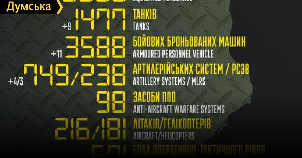 200 солдат, девять танков и четыре артиллерийские системы потеряли российские нацисты за минувшие сутки в Украине. Кроме того, как сообщает Генштаб Вооруженных сил, украинские защитники уничтожили 11 боевых бронированных машин, три РСЗО, три БПЛА оперативно-тактического уровня и четыре единицы автомобильной техники. Всего с начала полномасштабного вторжения потери врага составили: личного состава — 33 800 человек; танков ‒ 1477 единиц; боевых бронированных машин ‒ 3588 единиц; артиллерийских систем – 749 единиц; РСЗО — 238 единиц; средства ПВО - 98 единиц; самолетов – 216 единиц; вертолетов – 181 единица; БПЛА оперативно-тактического уровня – 601; крылатые ракеты — 130; корабли/катера — 14 единиц; автомобильной техники и автоцистерн — 2527 единиц; специальная техника – 55. СМЕРТЬ РОСІЙСЬКИМ ОКУПАНТАМ! Помітили помилку? Виділяйте слова з помилкою та натискайте control-enter |