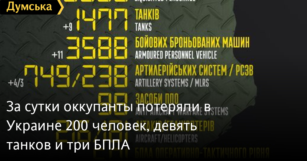 200 солдат, девять танков и четыре артиллерийские системы потеряли российские нацисты за минувшие сутки в Украине.