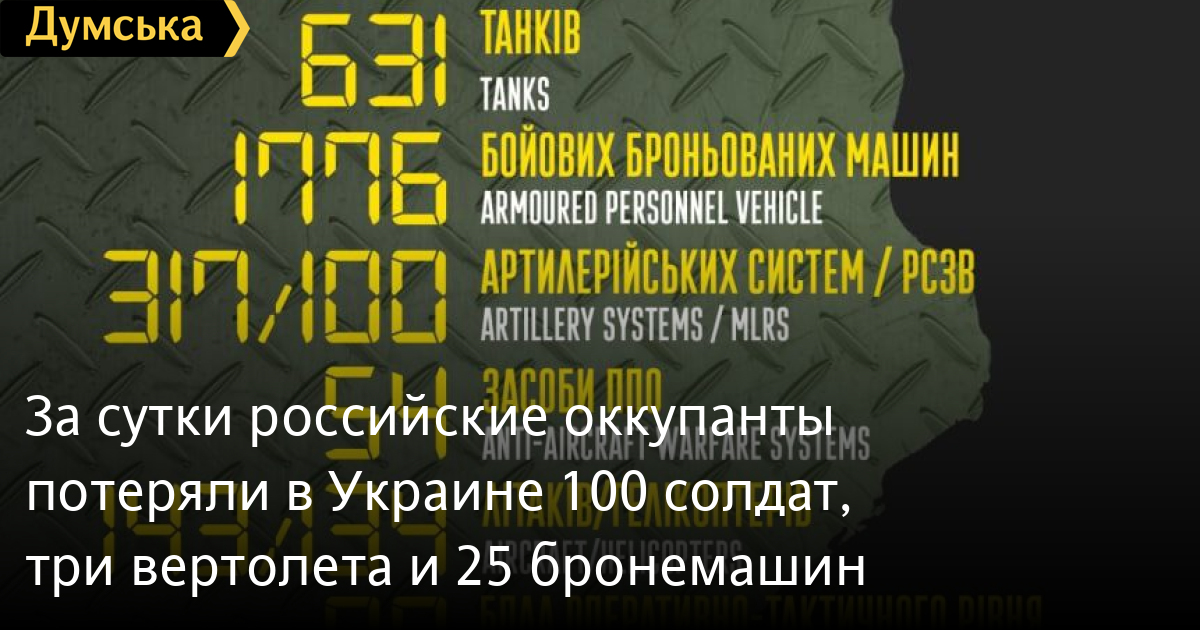 Так, за последние сутки погибли 100 солдат и офицеров российской армии (уже 17800 с начала вторжения).