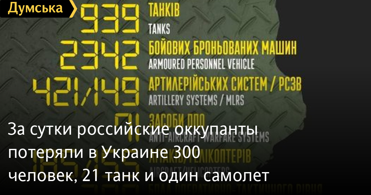 300 солдат, 21 танк и один самолет потеряли российские нацисты за минувшие сутки в Украине.