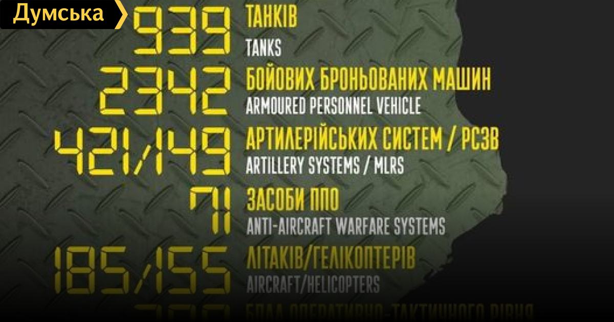 За сутки российские оккупанты потеряли в Украине 300 человек, 21 танк и один самолет300 солдат, 21 танк и один самолет потеряли российские нацисты за минувшие сутки в Украине. Кроме того, как сообщает Генштаб Вооруженных сил, украинские защитники уничтожили 5 артиллерийских систем, 34 боевые бронированные машины, 2 средства ПВО, один самолет и один вертолет, 23 единицы автомобильной техники, 2 БПЛА оперативно-тактического уровня. Всего с начала полномасштабного вторжения потери врага составили: личного состава — 22 300 человек; танков — 939 единиц; боевых бронированных машин — 2342 единицы; артиллерийских систем – 421 единицу; РСЗО — 149 единиц; средства ПВО - 71 единицу; самолетов – 185 единиц; вертолетов – 155 единиц; автомобильной техники — 1666 единиц; корабли/катера — 8 единиц; цистерн с ГСМ - 76; БПЛА оперативно-тактического уровня – 207; специальная техника – 31; пусковые установки ОТРК/ТРК — 4. СМЕРТЬ РОСІЙСЬКИМ ОКУПАНТАМ! Помітили помилку? Виділяйте слова з помилкою та натискайте control-enter |