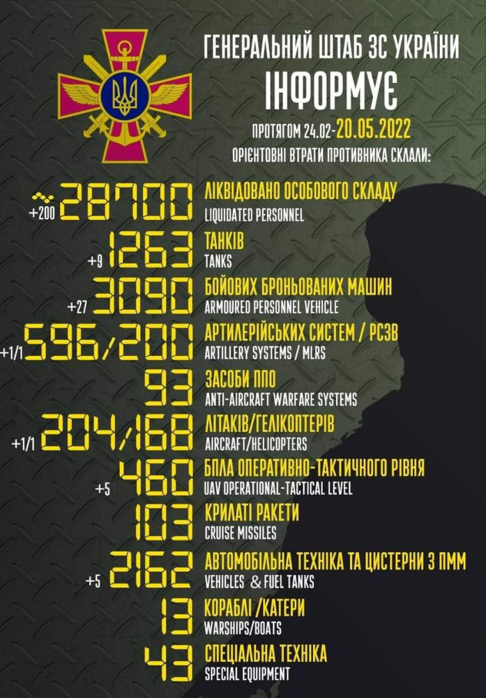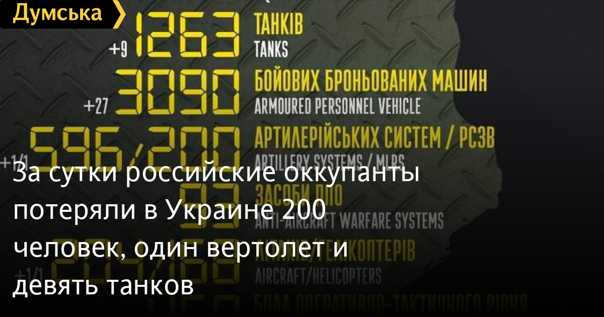 За сутки российские оккупанты потеряли в Украине 200 человек, один вертолет и девять танков200 солдат, девять танков и один вертолет потеряли российские нацисты за минувшие сутки в Украине. Кроме того, как сообщает Генштаб Вооруженных сил, украинские защитники уничтожили 27 боевых бронированных машин, одну артиллерийскую систему, одну РСЗО, один самолет, один вертолет, пять БПЛА оперативно-тактического уровня и пять единиц автомобильной техники. Всего с начала полномасштабного вторжения потери врага составили: личного состава — 28 700 человек; танков — 1263 единицы; боевых бронированных машин 3090 единиц; артиллерийских систем – 596 единиц; РСЗО — 200 единиц; средства ПВО - 93 единицы; самолетов – 204 единицы; вертолетов – 168 единиц; БПЛА оперативно-тактического уровня – 460; крылатые ракеты — 103; корабли/катера — 13 единиц; автомобильной техники и автоцистерн — 2162 единицы; специальная техника – 43. СМЕРТЬ РОССИЙСКИМ ОККУПАНТАМ! Заметили ошибку? Выделяйте слова с ошибкой и нажимайте control-enter |