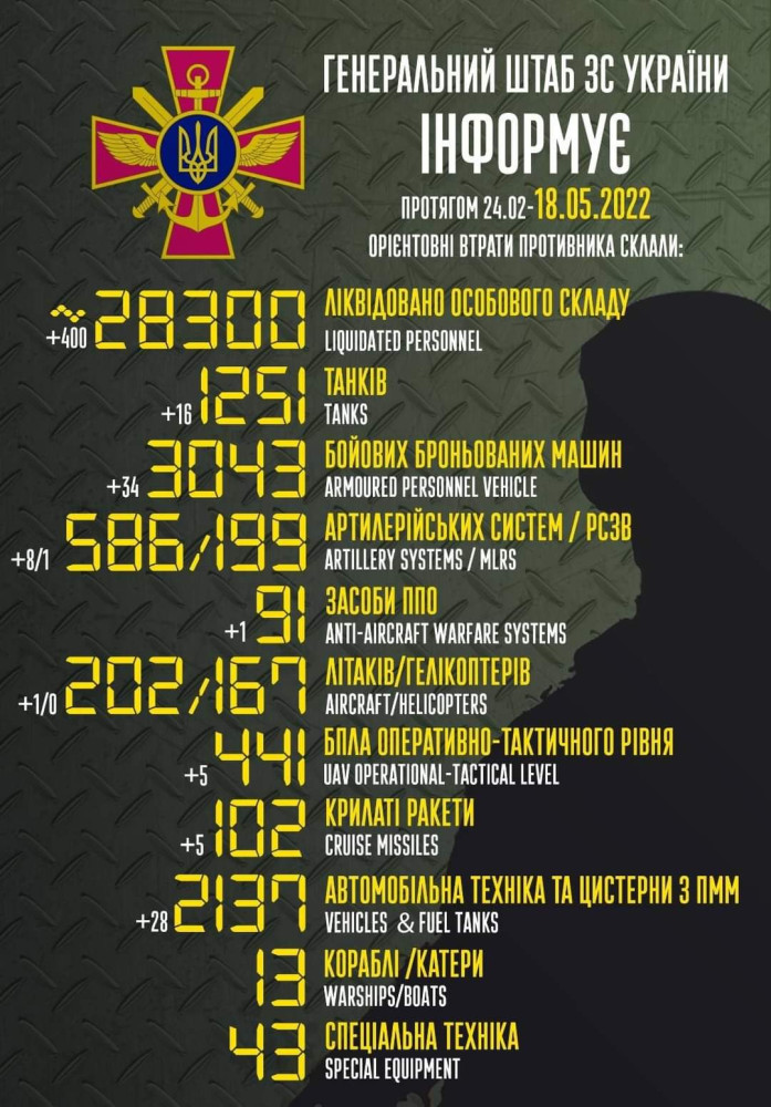 Кроме того, как сообщает Генштаб Вооруженных сил, украинские защитники уничтожили 34 боевые бронированные машины, восемь артиллерийских систем, одну реактивную систему залпового огня, одно средство ПВО, пять беспилотников оперативно-тактического уровня, столько же крылатых ракет и 28 единиц автомобильной техники.